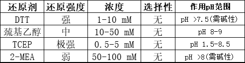 还原机理:通过巯基与二硫键交换,但还原能力较弱,需较高浓度。适合pH 8-9。 可能残留部分二硫键。