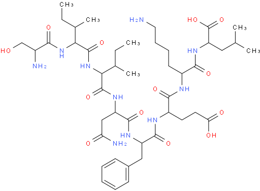 | 中文别名 | pOV8, Ser-Ile-Ile-Asn-Phe-Glu-Lys-Leu三氟醋酸盐, L-丝氨酰-L-异亮氨酰-L-异亮氨酰-L—天冬酰胺酰-L-苯丙氨酰基-L-a-谷氨酰-L-赖氨酰-L-亮氨酸 |